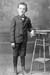 | 2001-867 |  | A black and white full-length photo of a young boy standing and wearing a trouser suit with a bow-tie, stockings, and leather boots.  He leans against a pedistal upon which a book rests. |