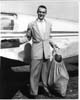 | 2000-206-8 | | Black and white photo of KTTS broadcaster Bill Maynard standing in front of a small airplane and holding a duffle bag with a football in it and a box holding a pair of football shoes. |