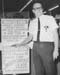 | 2001-51.316 | | A black and white photo of a man standing next to a Sweepstakes sign and box. |
