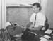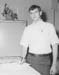 | 2001-51.567 | | A black and white photo of a man standing next to a desk and refrigerator. |