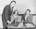 | 2001-51.288 | | A black and white photo of two men interviewing an attractive woman. |