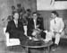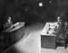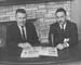 | 2001-51.425 | | A black and white photo of two men seated behind a desk with an open book between them. Man on right has a microphone. |