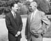 | 2001-51.550 | | A black and white photo of two men standing ouside conversing. |