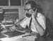 | 2001-51.411 | | A black and white photo of a man wearing glasses, sitting at a desk and talking on a telephone. |