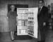 | 2001-51.508 | | A black and white photo of a man and woman flanking a freezer fully stocked with different flavors of ice cream. |
