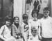| 2001-51.619 | | A black and white photo of a family of six standing outside of a store front. Some of the children holding groceries. |