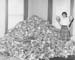 | 2001-51.523 | | A black and white photo of a woman standing next to a pile of dairy cartons. She holds Cloverleaf cottage cheese containers in her hands. |