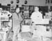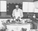| 2001-51.606 | | A black and white photo of a man with glasses and apron cutting into a roast and preparing several platters. He stands in a kitchen setting behind a counter. |