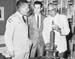 | 2001-51.428 | | A black and white photo of three men standing around a trophy. The man (left) wears a military uniform. |