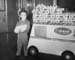 | 2001-51.509 | | A black and white photo of a young boy wearing a Colonial Bread delivery costume. He is holding a box of rolls and stands nest to a delivery truck filled with rolls. |