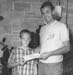| 2001-51.671 | | A black and white photo of Jerry Sweaney holding a check with a small boy who won the prize at the KTTS Fish for Money contest. |