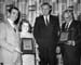 | 1992-232.1286 | | A black and white photo of six women seated around the table in a Home Economics course being filmed by a KTTS camera. |
