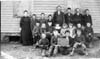 | 1999-132 | | Black and white photo, mounted on cardboard, of the Pleasant Hill School, a large class posed outside their frame one room school. |
