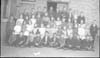 | 1999-128 | | Sepia tone photo, mounted on cardboard, of an elementary school class and their teacher posed outside a brick school building. |