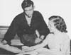 | 1992-232.1843 | | A black and white cut-out photo of a female high-school student seated at her desk, and a male student seated on her desk, as they look over their school work. |