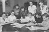 | 1992-232.1909 | | A black and white photo of several journalism students looking at their school newspaper. |