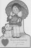 | 2002-885.39 | | It is a valentine card with a girl in a red dress with a blue umbrella standing next to a cat with a black and white checkered bow. The text reads "Valentine Greetings , To a good little girl I know". On the back is handwritten " frm Miss Ruth". The paper is cardboard and the card is meant to stand upright. It is a valentine given to Mary Ruth Johnson McShane (1909-2001) of Mt. Vernon during her school years. |