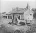 | 2001-222-1-1 | | Black and white photograph of a wagon shop with the First Cumberland Presbyterian Church in the background. In front there is a man holding two horses with a wagon nearby. The church stood on the southwest corner of Olive St. and Jefferson Ave. |
